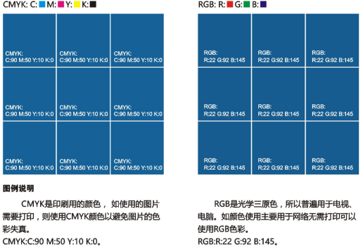 标准色在任何情况下均不可随意更改,色彩表现细微差异产生的视觉效果有很大不同,使用时严格按标准执行。因不同软件的色彩配置有所差异,标准色的RGB色彩及相应的数值以Adobephoto-shop(R)软件下文件色彩系统为标准;CMYK色彩及相应的数值以CoreIDRAW X4软件下文件色彩系统为标准。